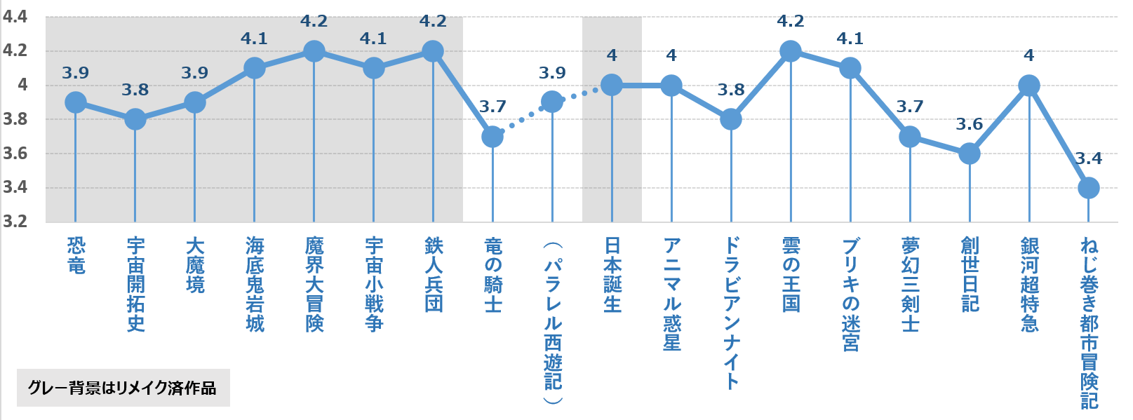 - 初期2作(宇宙開拓史、大魔境)のレビュー値については「原作と違い改悪」という理由での低評価が目立ちます。確かに2、3は確かにアレンジが強く、大魔境はF先生も「私の世界を理解していない」と評した等もあり映画版としての評価が下がる要因です。それらはリメイク可否を決める原作の持つ評価とはいえないため、少し高く補正をかけています。